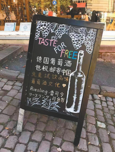 德國法蘭克福,當地葡萄酒商推出了中文廣告牌。記者 李強攝