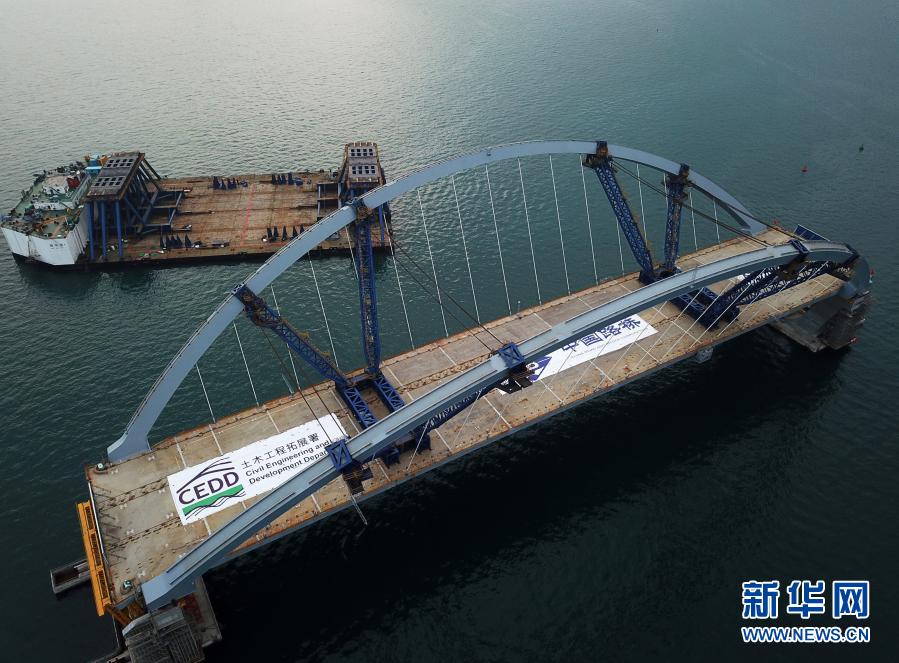 2月26日,從早晨7時開始,歷時5個小時,首次利用海潮漲落的“浮托法”,70多位現(xiàn)場施工人員經(jīng)過緊張調(diào)試,將內(nèi)地預制好的雙拱鋼橋精準對接并安裝在橋墩上。
