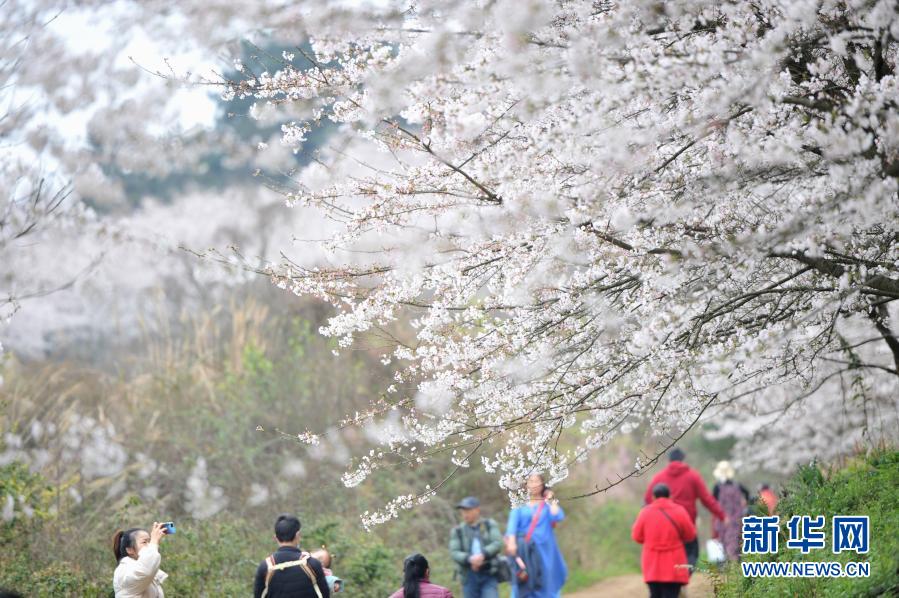 春季里,貴州省貴安新區紅楓湖畔的櫻花園內櫻花綻放,花海如云似雪,吸引游人踏春賞櫻。