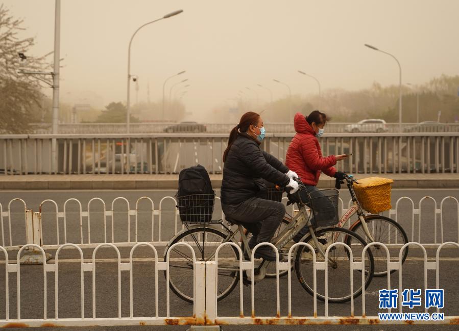 3月15日,市民騎車行駛在北京德勝門附近的道路上。當日,我國北方多地出現(xiàn)沙塵天氣。新華社記者 賈浩成 攝