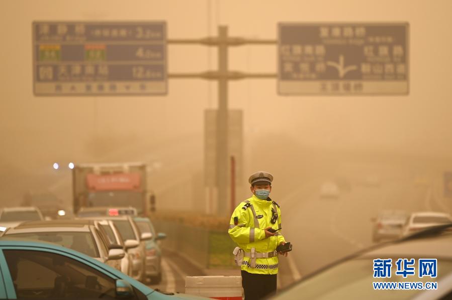 3月15日,交警在天津市南開區(qū)道路上執(zhí)勤。當(dāng)日,我國北方多地出現(xiàn)沙塵天氣。新華社記者 李然 攝