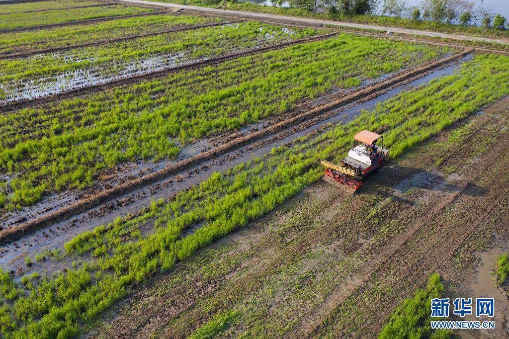 4月5日,浙江紹興諸暨市次塢鎮紅旗村紅旗合作社農民駕駛農機在翻耕農田,準備播種早稻(無人機照片)。