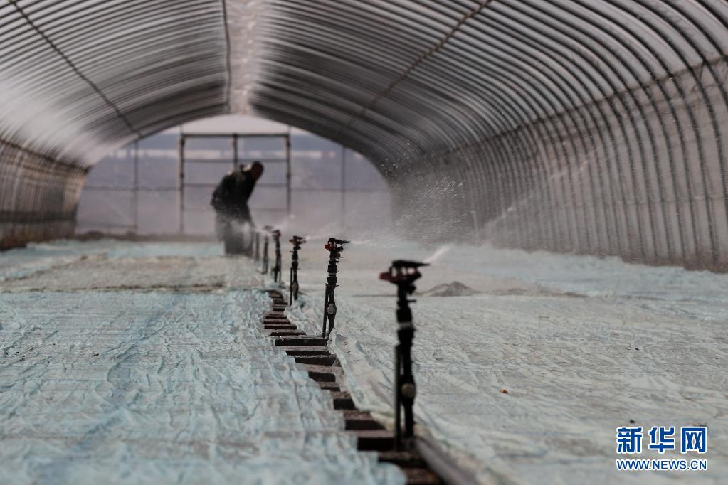 4月6日,河北省唐山市海港經(jīng)濟(jì)開(kāi)發(fā)區(qū)水稻種植合作社的社員在育秧棚內(nèi)給秧盤(pán)澆水。