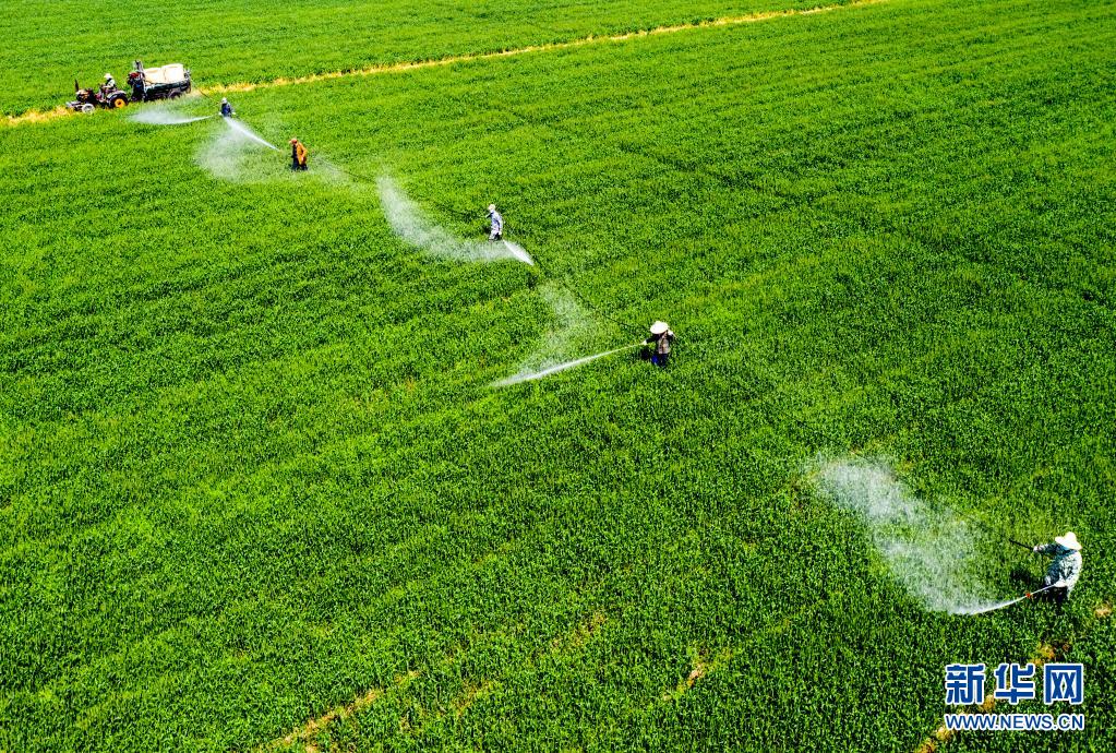 4月6日,安徽省合肥市廬江縣白湖鎮白湖社區,農民在田間進行小麥赤霉病防治作業。