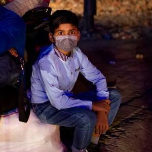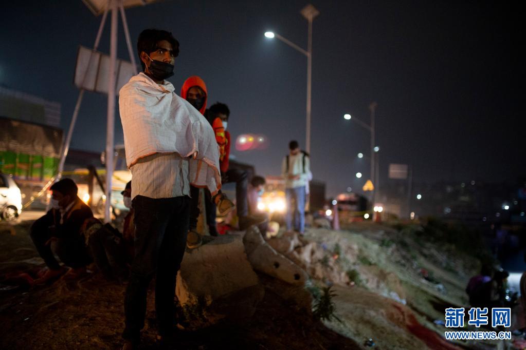 4月28日晚,人們在尼泊爾首都加德滿都的路邊等車,準備在封禁措施實施前離開加德滿都返回家鄉。