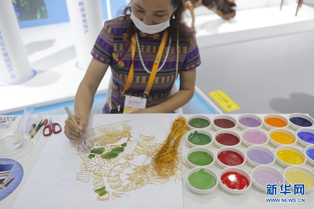 5月8日,一名參展商在消博會現(xiàn)場制作景泰藍畫。新華社記者 丁洪法 攝