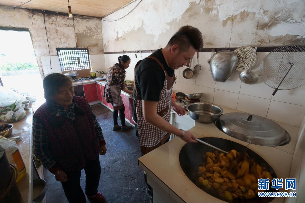5月4日,邱超(右)和母親李蕓香(中)、奶奶在廚房準備飯菜。 新華社記者 江宏景 攝