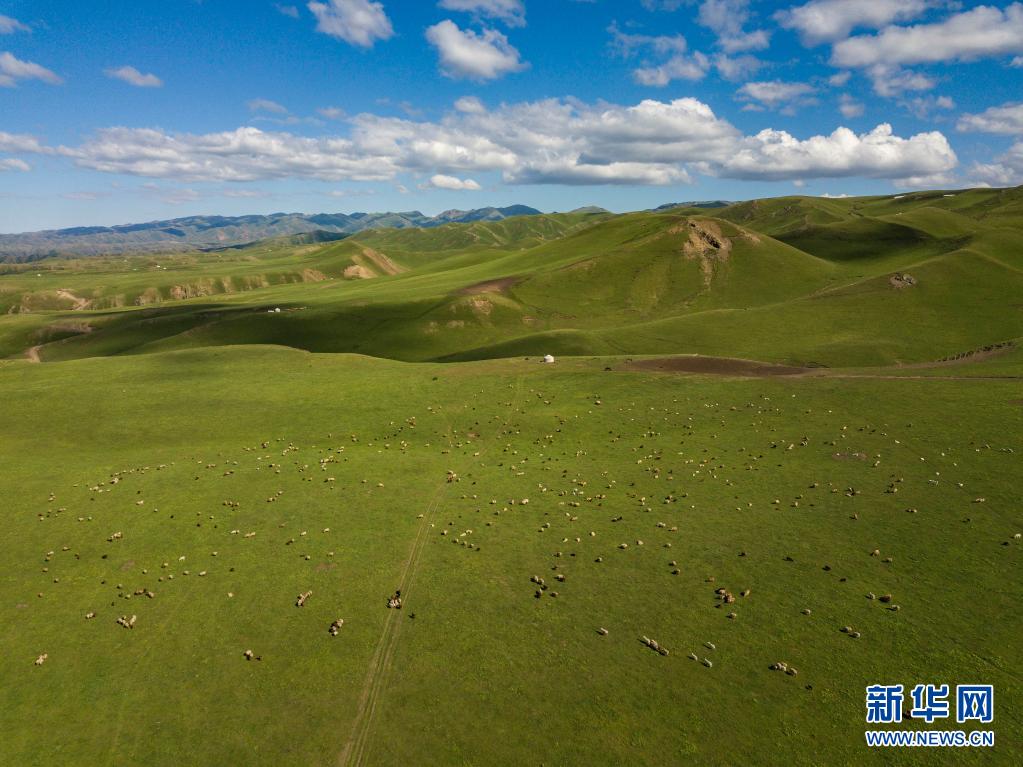 新疆裕民縣巴爾魯克山區夏牧場上的牛羊、氈房(6月15日攝,無人機照片)。
