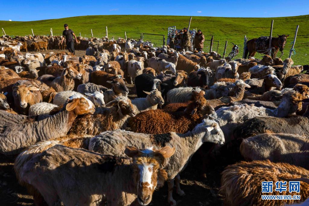 來(lái)自縣城的商人在裕民縣巴爾魯克山區(qū)夏牧場(chǎng)上收購(gòu)小羊(6月14日攝)。