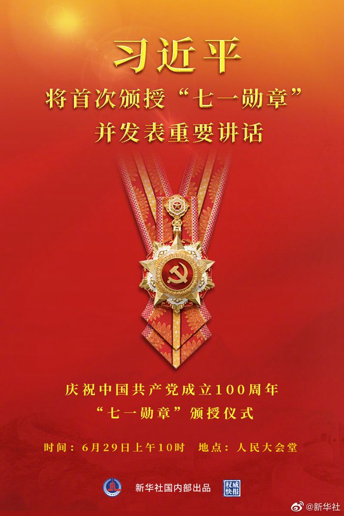 慶祝中國共產黨成立100周年“七一勛章”頒授儀式將于29日上午10時在人民大會堂隆重舉行。習近平為“七一勛章”獲得者頒授勛章并發表重要講話。