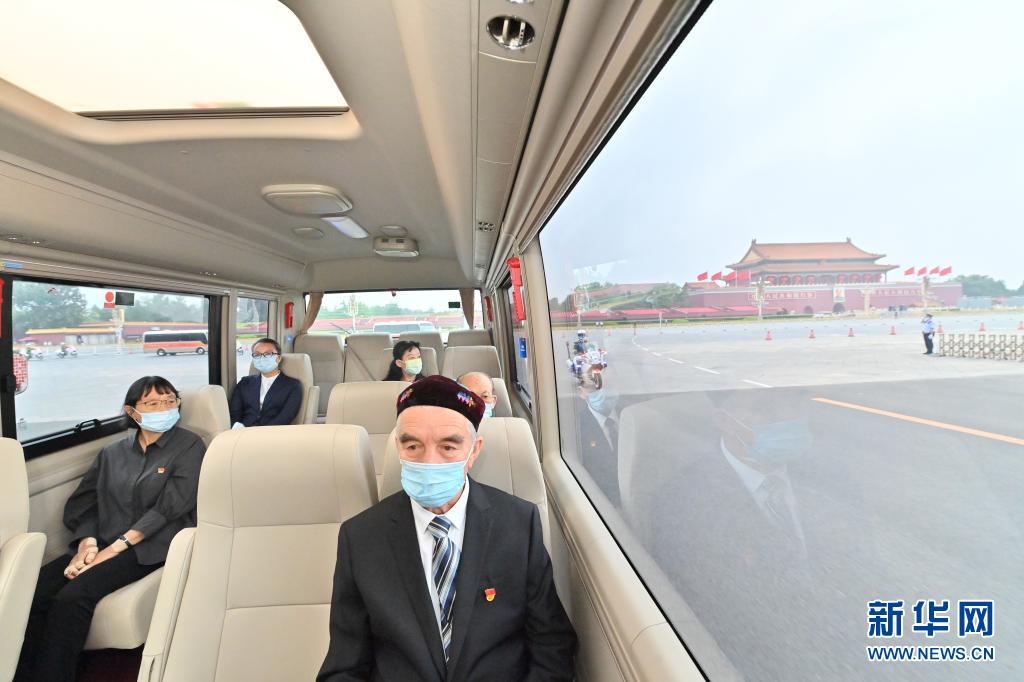這是買買提江·吾買爾(前)、張桂梅(左一)、吳天一(右一)乘車前往人民大會堂。