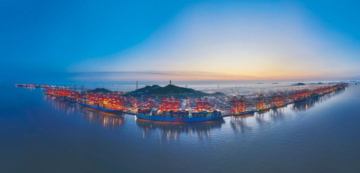 清晨六点,上海洋山港四期自动化码头,AGV(全自动无人导引车)上一只红色集装箱伴着霞光移动,经由桥吊远程操作被稳稳抓起,精准吊装搬运到远洋班轮的甲板上。这个全球单体规模最大、智能化程度最高的全自动化集装箱码头,24小时不间断作业,一个昼夜的吞吐量可超27000标准箱。
