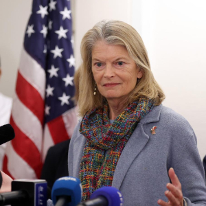 2月9日,在丹麦自治领地格陵兰岛首府努克,美国阿拉斯加州共和党参议员莉萨·穆尔科斯基出席新闻发布会。新华社记者 李颖 摄