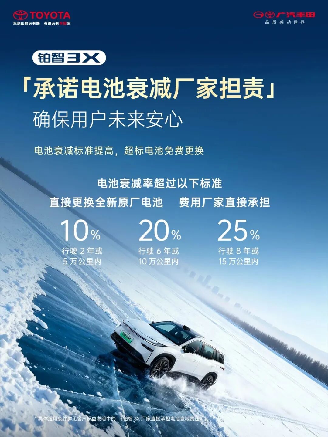 广汽丰田新发布的政策承诺:在车辆使用两年或行驶五万公里内,若电池衰减超过10%;六年或十万公里内超过20%;八年或十五万公里内超过25%,厂家将免费更换全新原厂电池,所有费用由厂家承担。这也被认为是显著高于行业普遍执行的质保条款。