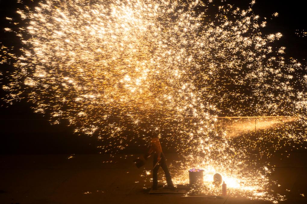 近日,首届“浦东中国年味节”在上海市浦东新区黄浦江畔举行,非遗“打铁花”成为夜色中一道亮丽的风景线。