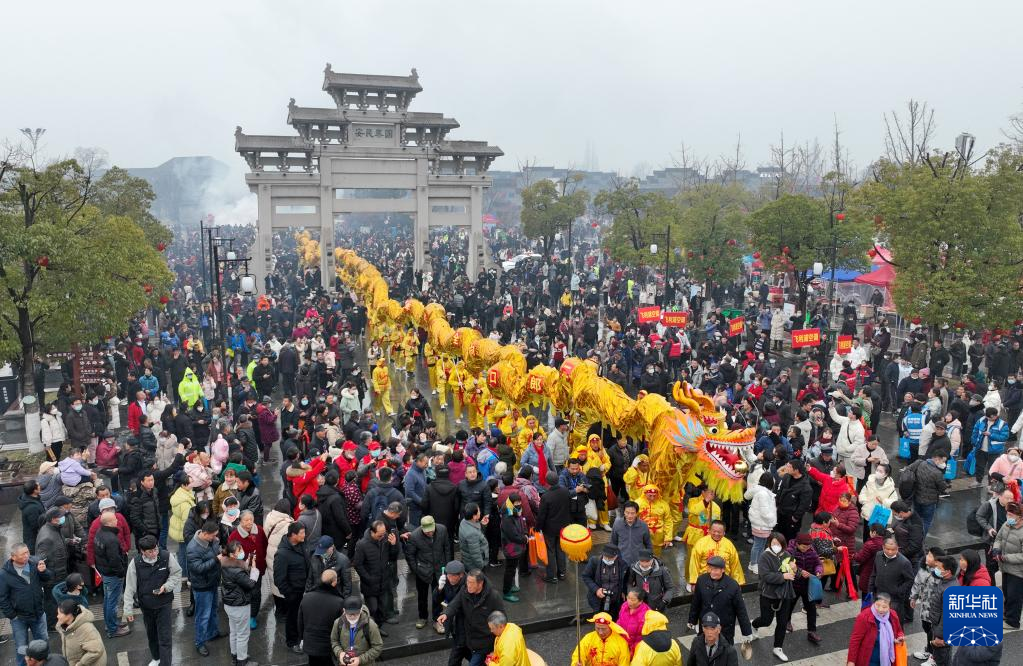 2月6日,人们在全椒县太平文化广场观看舞龙表演(无人机照片)。