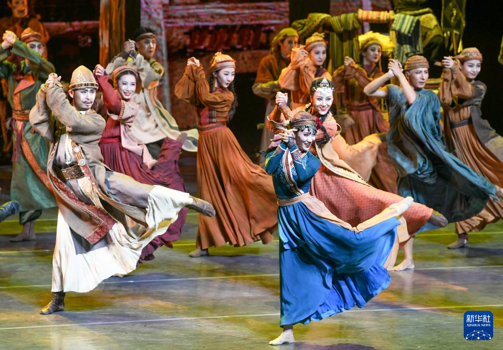 2月28日,在乌鲁木齐京剧院,演员在表演舞剧《五星出东方》。