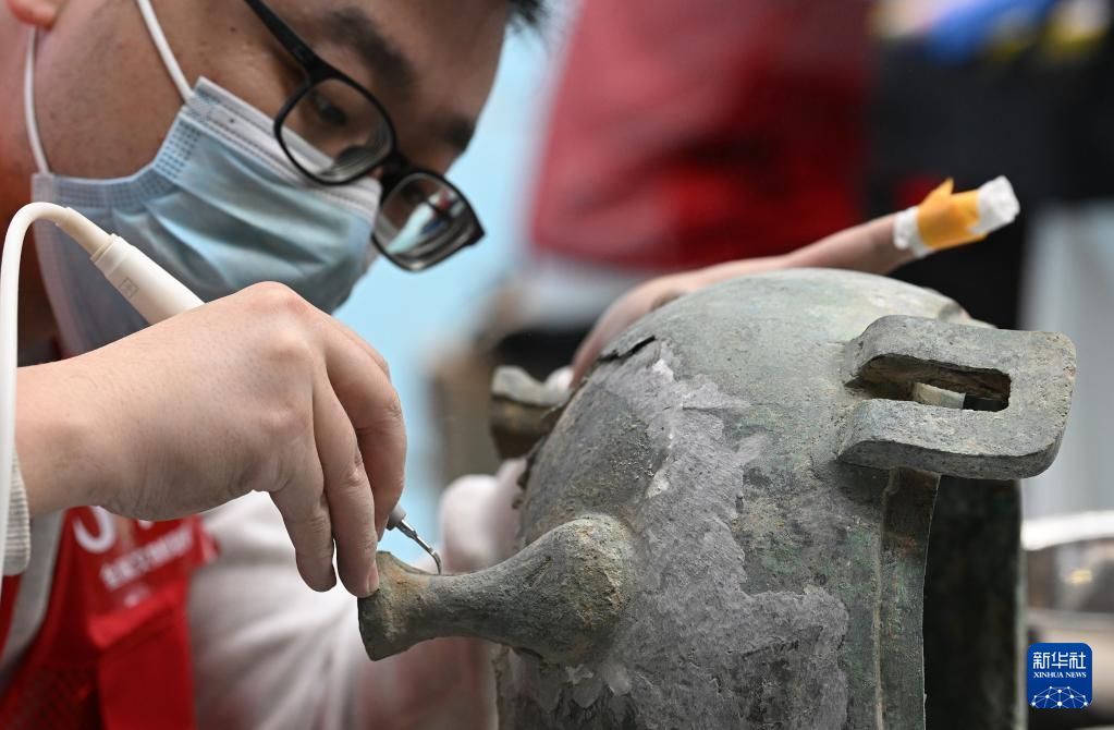 3月25日,参加金属文物修复师比赛项目的选手在现场修复文物。