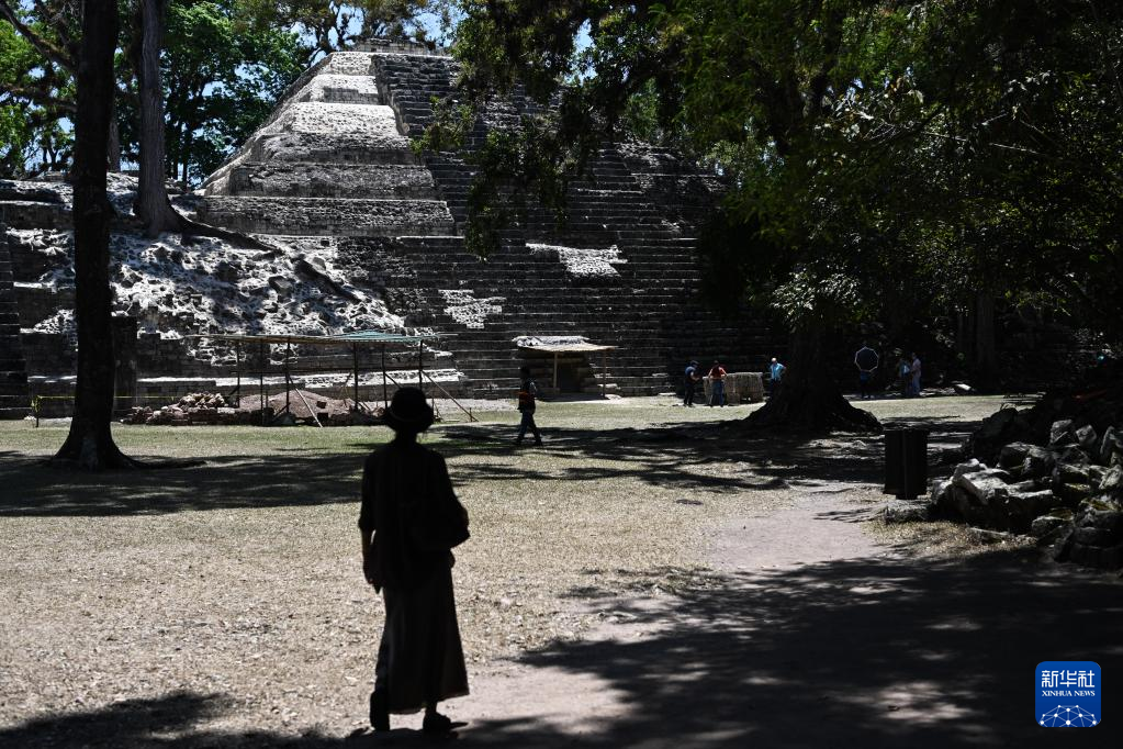 4月1日,游客在洪都拉斯科潘玛雅古城遗址内参观。