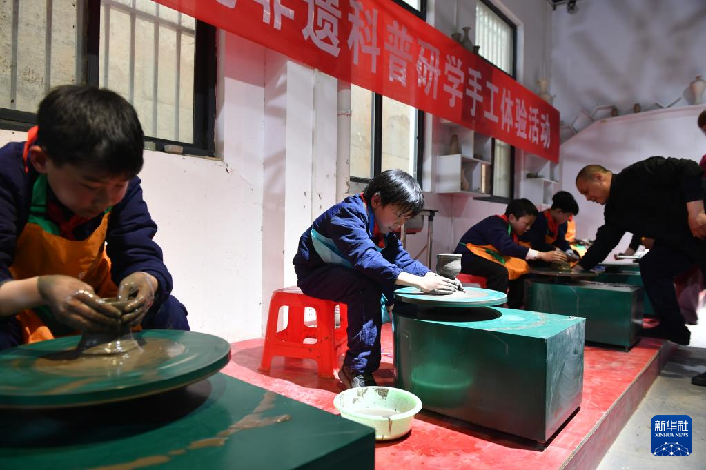 4月13日,在河南省汝州市一家汝瓷研学馆内,几名小学生在进行汝瓷手工体验活动。