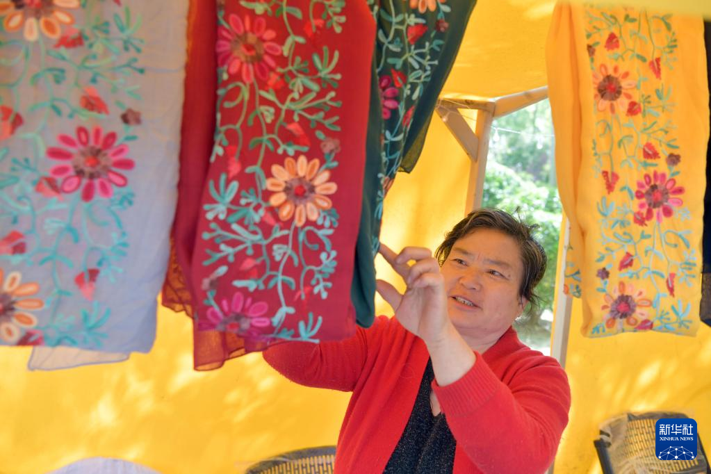 4月18日,非遗传承人在东营市清风湖黄河大集上介绍刺绣丝巾。