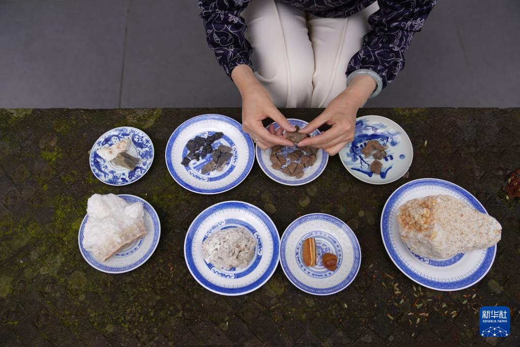 4月19日,在江西景德镇,蔡文娟在“青花故事”创作基地挑选原矿料。
