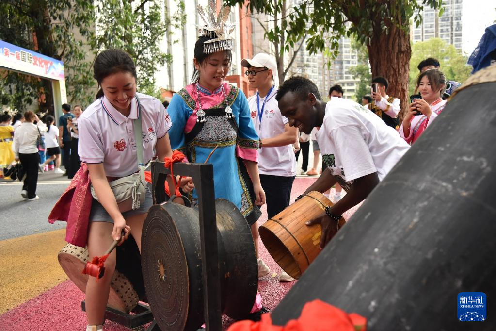 6月5日,参加三都高级中学第一届国际文化节的来华留学生体验敲击铜鼓。