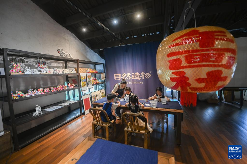 在位于杭州瓶窑老街的自然造物民艺研究中心内,工作人员带着孩子们在体验泥塑彩绘技艺(5月28日摄)。该中心是占地3500多平方米的民间手工艺文化空间,集中展示来自全国二十多个省份数千种手工艺产品。顾客也可以在这里体验包括木版年画拓印、泥塑彩绘、油纸伞制作、竹编灯笼、刺绣等非遗技艺。