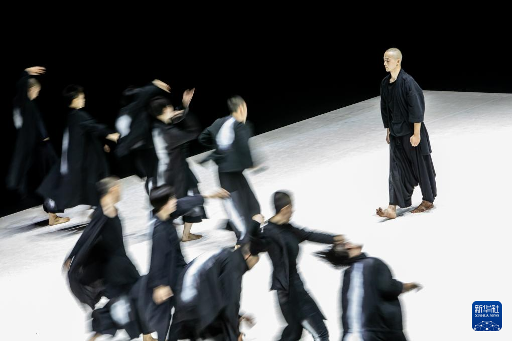 7月14日,中国“陶身体剧场”舞团的舞蹈演员在希腊南部卡拉马塔市的舞蹈剧场表演。新华社发(帕纳约蒂斯·莫斯卡德里欧摄)