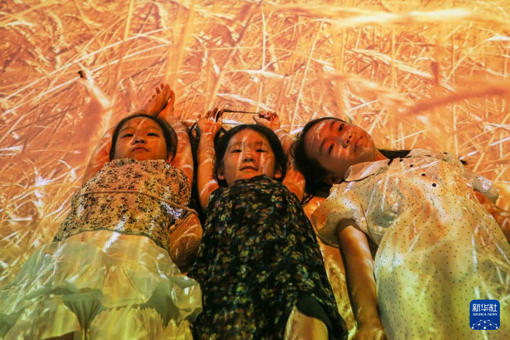 7月16日晚,参观者在“梵高再现”光影展上的向日葵镜厅拍照留念。