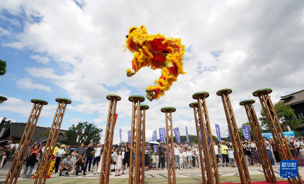 7月21日,游客在贵州省黔东南苗族侗族自治州丹寨县万达小镇观赏“南海醒狮”表演。