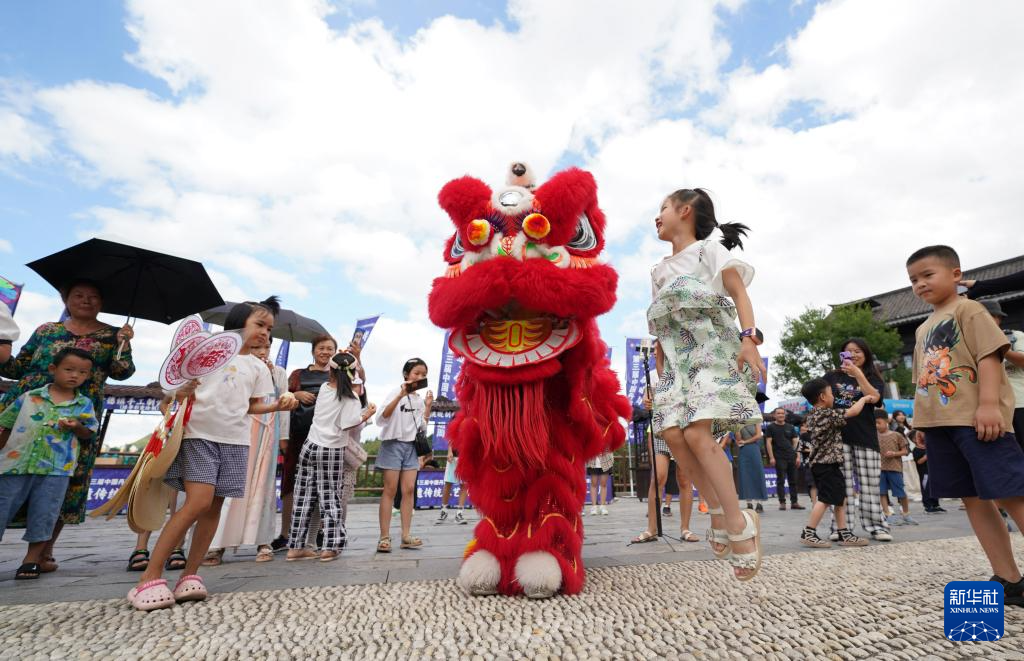 7月21日,在贵州省黔东南苗族侗族自治州丹寨县万达小镇,小朋友与“南海醒狮”表演者互动。
