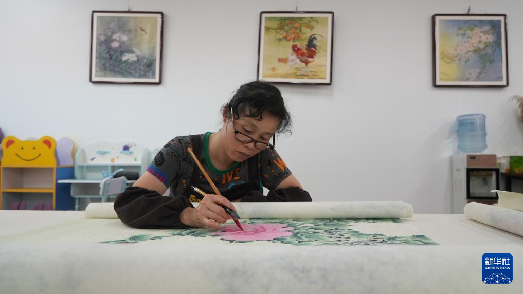 7月24日,画师在山东省巨野县书画院绘制工笔画作品。