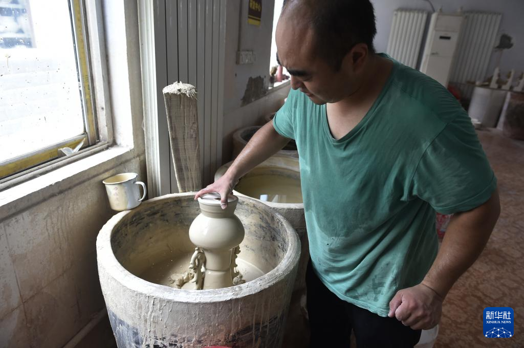 8月3日,河南省禹州市神垕镇一家钧瓷企业的工作人员在车间里施釉。
