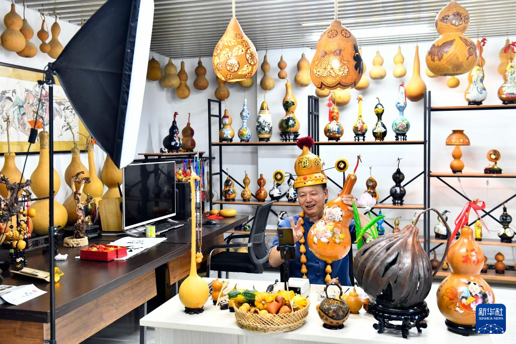 8月10日,在枣庄市薛城区葫芦刻绘非遗工坊,“周氏葫芦刻绘”非遗传承人周建华在直播推介葫芦刻绘作品。