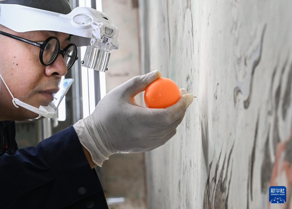 在敦煌莫高窟正在保护修缮的第55窟内,文保工作者对现场模拟试块进行对比测试(8月3日摄)。