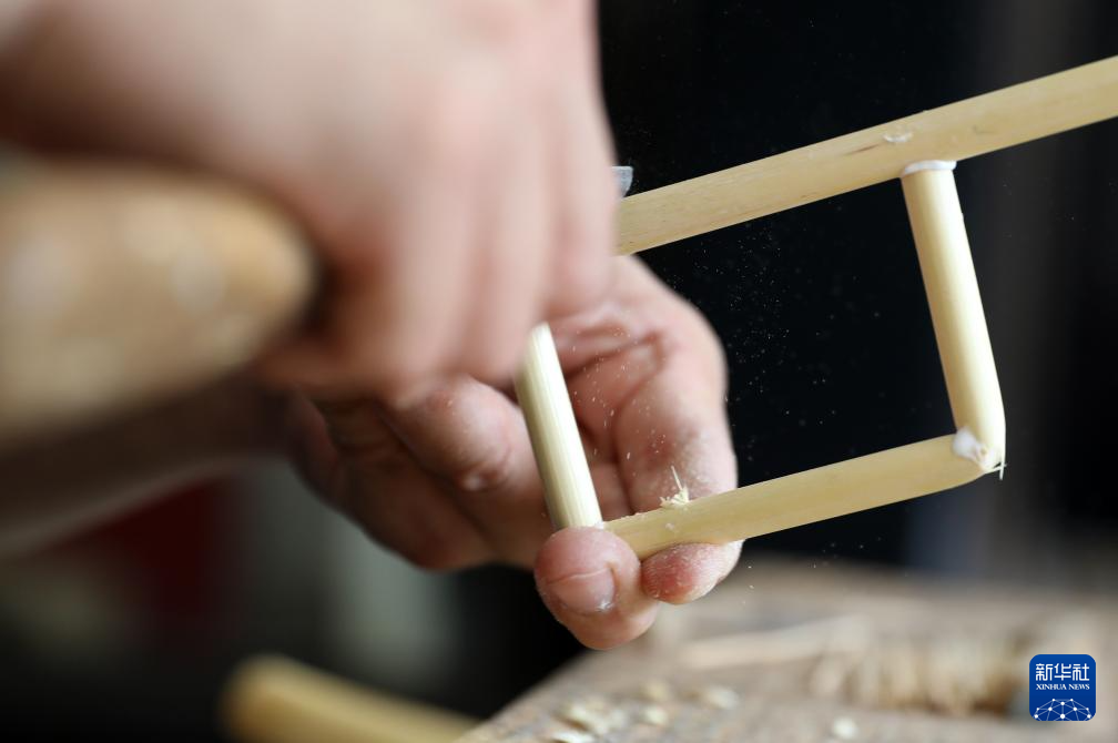 8月17日,崔凯在辽宁省营口市自己家中打磨吉祥轮彩纸风车骨架。