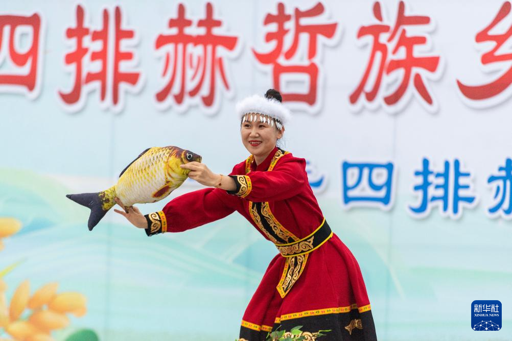 8月30日,在黑龙江省饶河县四排赫哲族乡,赫哲族人在河灯文化节上表演。