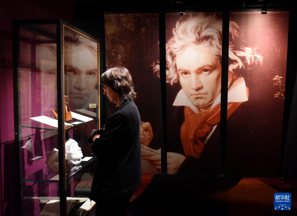 9月2日,一名观众在奥地利维也纳“音乐之家”贝多芬展厅参观展品。