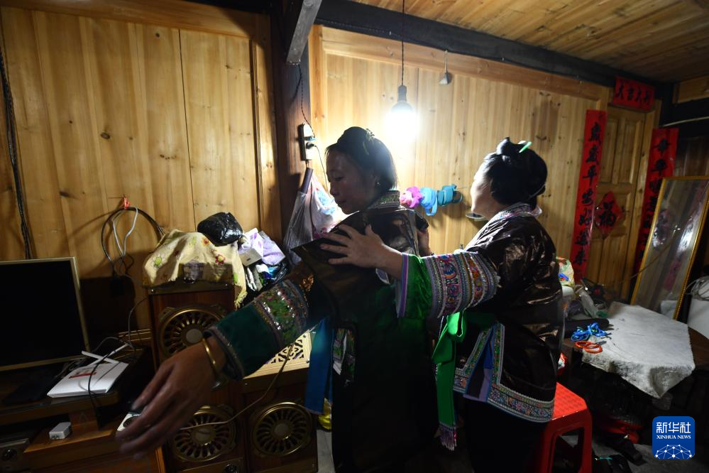 乌英苗寨妇女韦妹丽(右)在给亮布刷蛋清(2020年9月2日摄)。