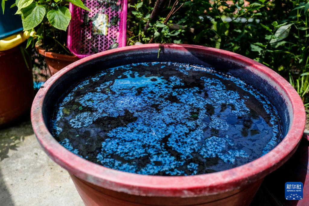 这是乌英苗寨妇女梁足英用山泉水浸泡蓝靛草三天后,药水呈现的颜色(2023年8月31日摄)。