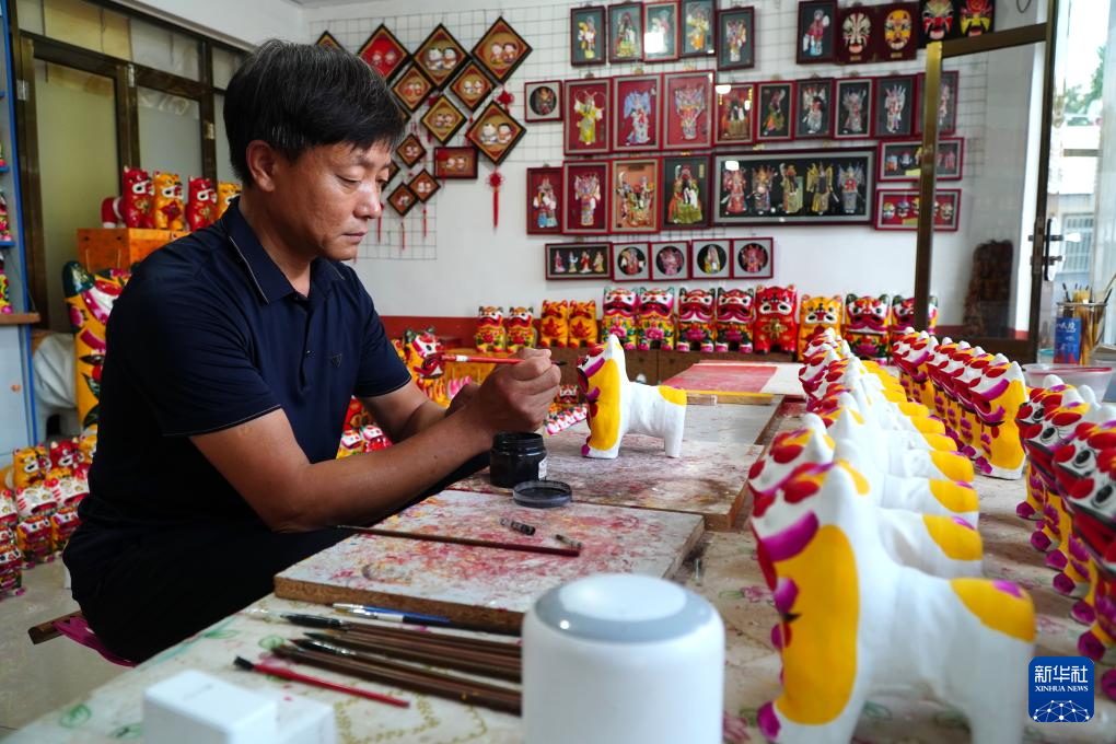 9月5日,在山东省高密市姜庄镇的一处非遗工坊,村民聂祥之在制作泥老虎产品。