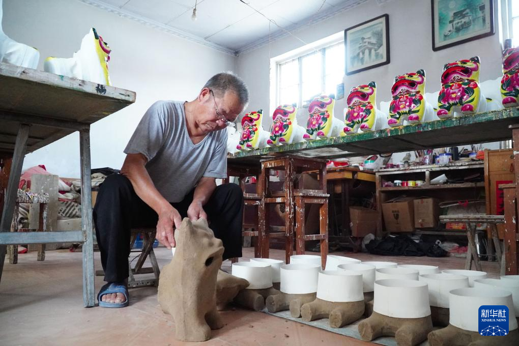9月5日,在山东省高密市姜庄镇的一处非遗工坊,非遗代表性传承人聂臣希在制作泥老虎产品。