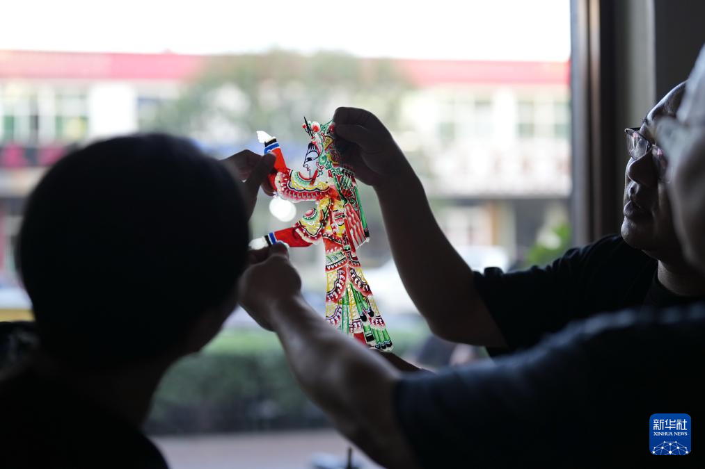 9月13日,市民在河北省乐亭县一处皮影工坊内了解皮影人制作技术。