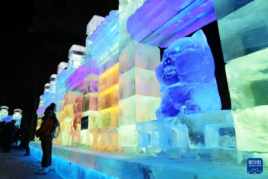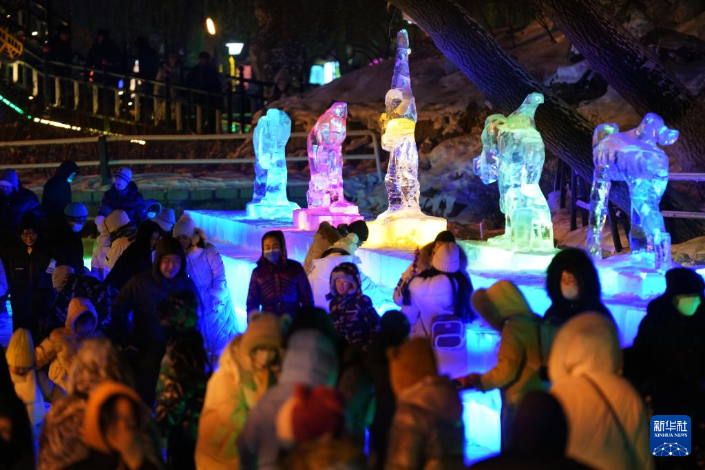 12月31日,游客在哈尔滨冰灯艺术游园会园区内游玩。