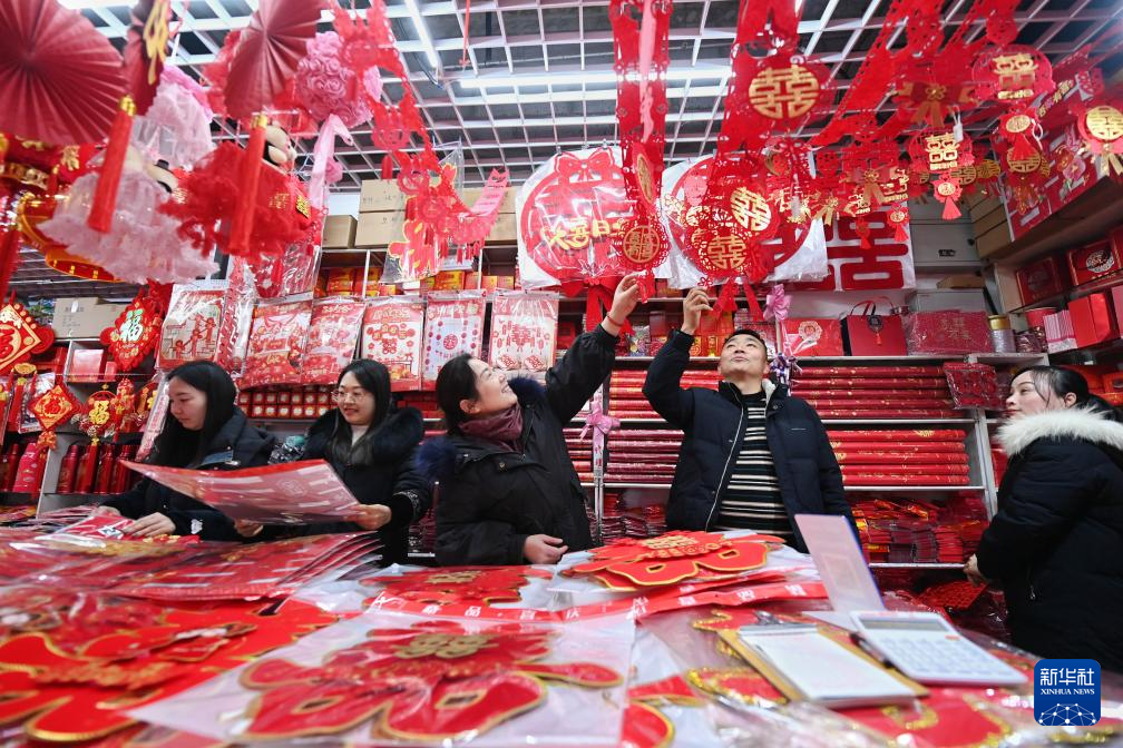 1月19日,人们在河南省开封市年货批发市场选购春节饰品。