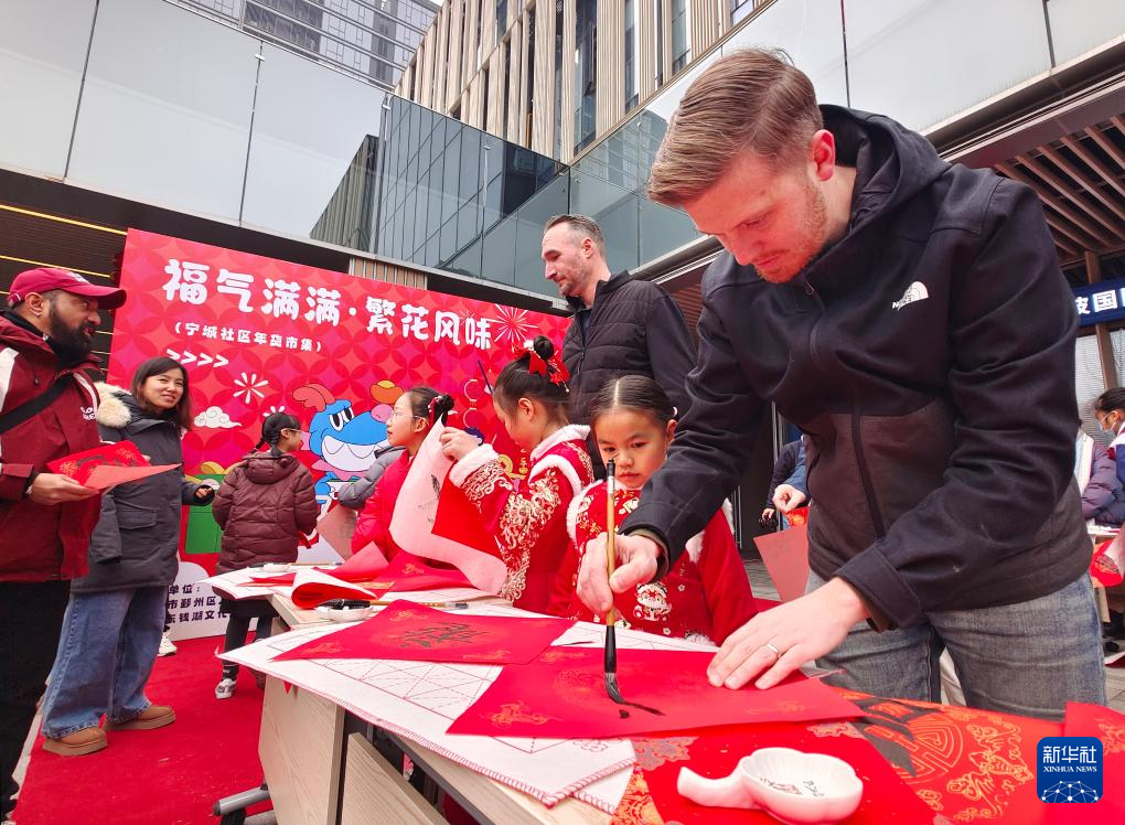 1月21日,在浙江省宁波市国际人才社区年货集市广场,外国友人学写中国“福”。