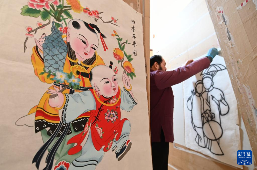 1月21日,在山东潍坊高密市姜庄镇的一家年画作坊,民间艺人在创作扑灰年画。