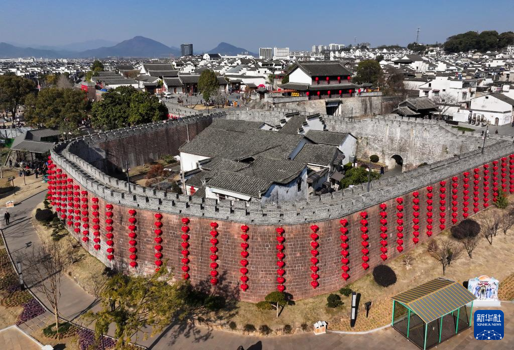大红灯笼扮靓徽州古城(1月25日摄,无人机照片)。
