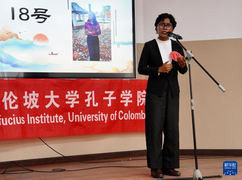 5月27日,选手在科伦坡举行的“汉语桥”斯里兰卡赛区比赛上演讲。